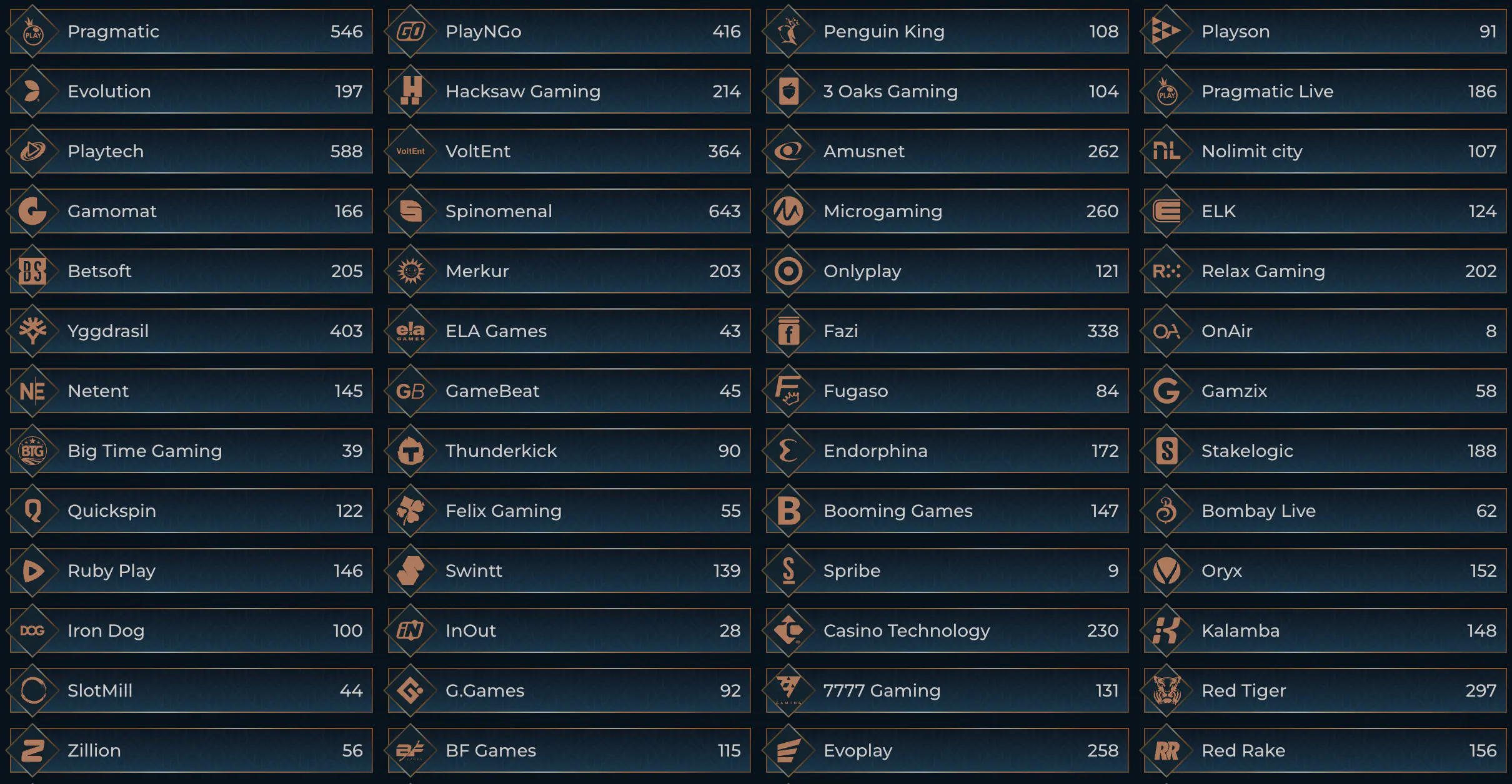 Το καζίνο συνεργάζεται με δεκάδες κορυφαίους παρόχους λογισμικού για να προσφέρει ένα ευρύ φάσμα από κουλοχέρηδες καζίνο, επιτραπέζια και live παιχνίδια. Μεταξύ των πιο γνωστών είναι οι: